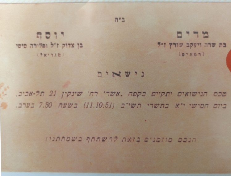 קבענו תאריך נישואינו, יום חמישי י"א בתשרי תשי"ב 11-10-1951 שעה 7:30 בערב, בקפה "אשר" רחוב שינקין 21 תל-אביב. פרסמנו את נישואינו בעתון "הבוקר" ושלחנו הזמנות.