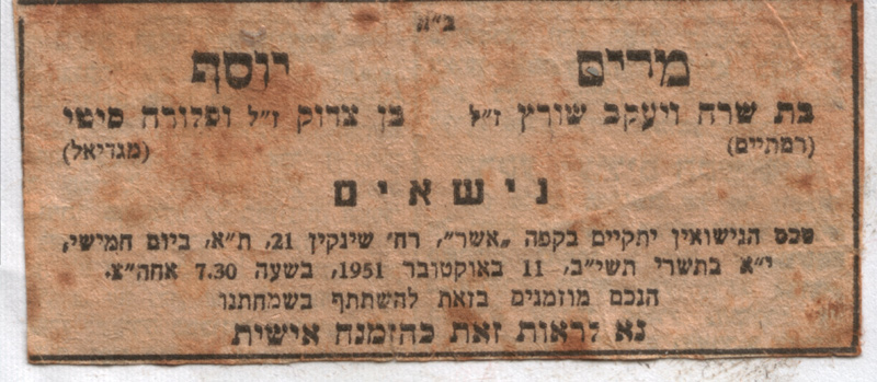 פרסום נשואינו בעיתון הבוקר 1951